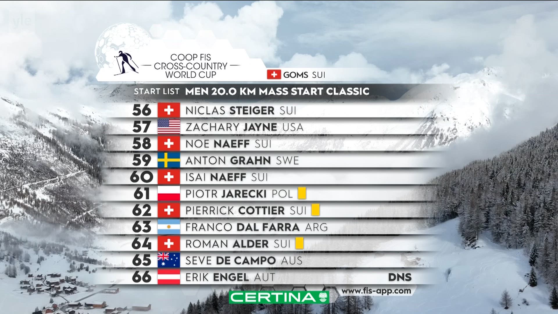 "title": "Miesten 20 km yhteislähtö, Goms",